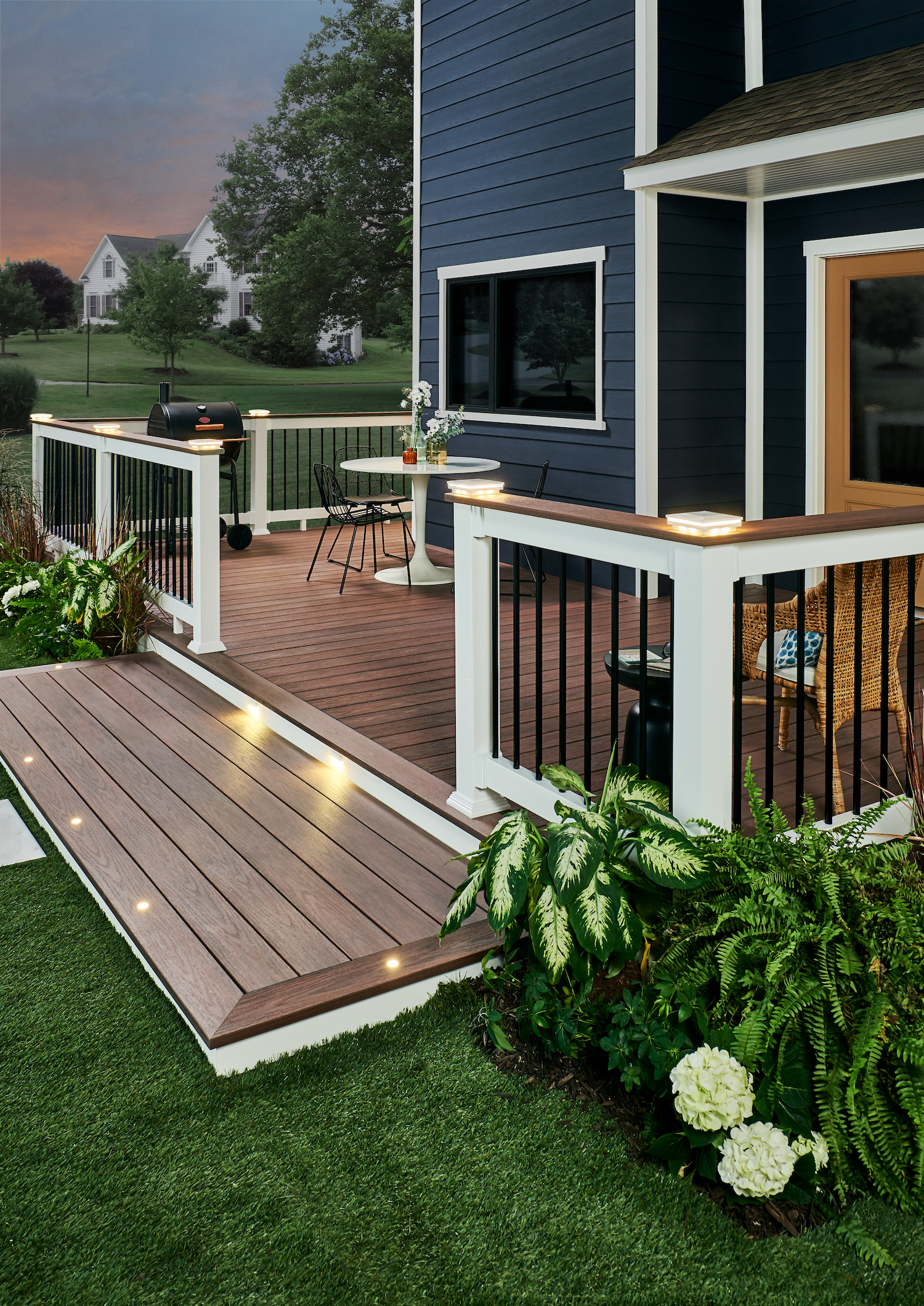 A seamless transition from inside to outside boosts the appeal of your home. Higher-end PVC options from Wolf Decking & Porch are available with tongue and groove boards to create a solid surface, similar to indoor flooring, but made to withstand outdoor elements. Plus, several product brands offer a lifetime residential warranty that can be transferred to a new homeowner, so the deck is guaranteed to look incredible for years to come.